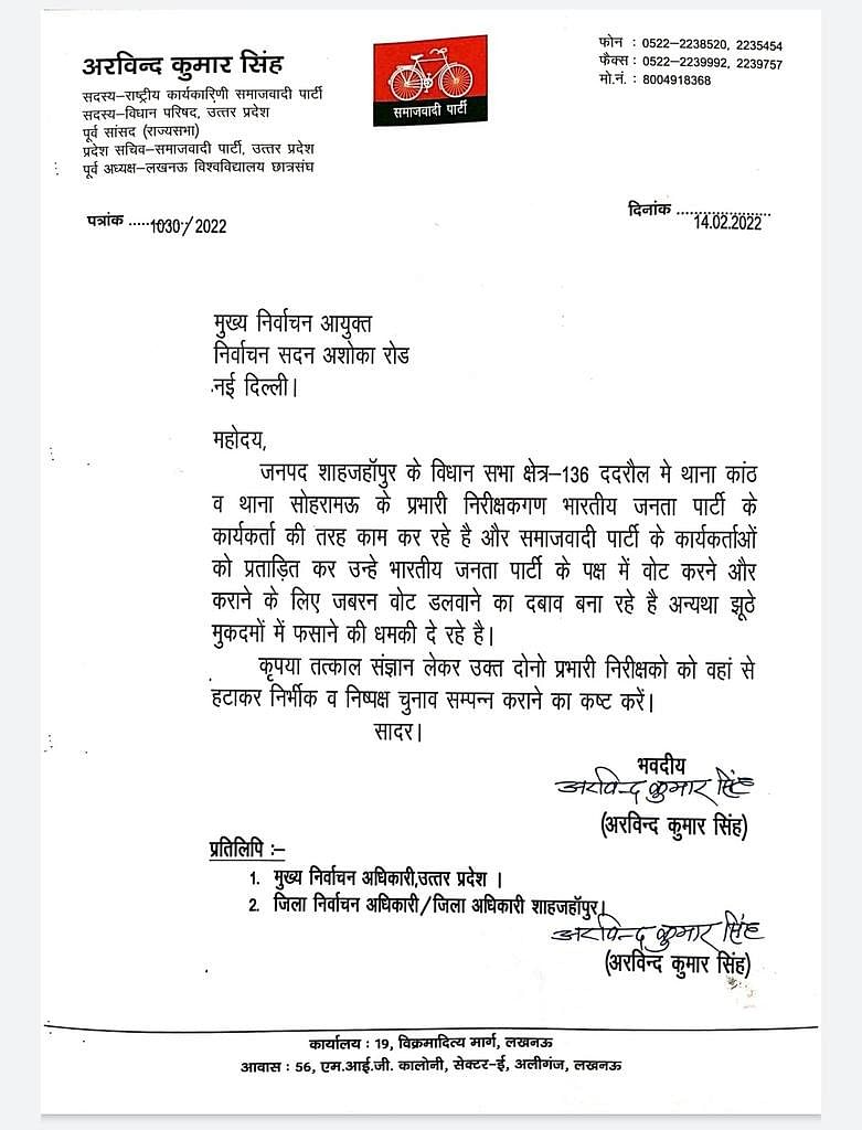 समाजवादी पार्टी के राष्ट्रीय कार्यकारिणी सदस्य अरविन्द कुमार सिंह ने सोमवार को मुख्य निर्वाचन आयुक्त से लिखित शिकायत की है। उन्होंने आरोप लगाया है कि विधानसभा क्षेत्र-01 की बेहट की बूथ संख्या 170 पर गड़बड़ी मिली है। इसके अतिरिक्त बूथ संख्या 377 पर वोट डालने जाने वाली जिन महिलाओं को यह कहकर भगाया जा रहा है कि उनका वोट पड़ चुका है। बूथ संख्या 403 पर भी गड़बड़ी मिली है। अरविन्द सिंह ने पत्र में मुख्य निर्वाचन आयुक्त से लिखित शिकायत कर निष्पक्ष चुनाव कराये जाने की मांग की है।