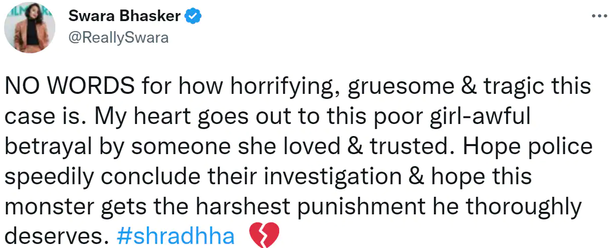 स्वरा भास्कर लिखती हैं कि उनके पास इस दिल दहला देने वाली घटना के लिए कोई शब्द नहीं है। उन्होंने आरोपी को ‘राक्षस’ कहा है। स्वरा ने ट्वीट किया, ‘यह घटना भयावह, रोंगटे खड़ा कर देने वाला और दुखद है। इसके लिए मेरे पास कोई शब्द नहीं है। उस लड़की के साथ विश्वासघात किया गया जिसे वह प्यार करती थी, जिस पर वह भरोसा करती थी। उम्मीद है पुलिस जल्द ही मामले में अपनी जांच पूरी करेगी और उस राक्षस को कड़ी से कड़ी सजा मिलेगी जिसका वह हकदार है। ‘