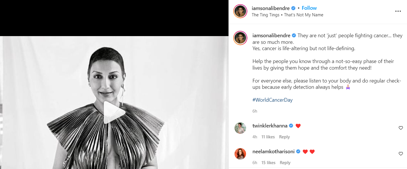 इस वीडियो के जरिये उन्होंने बताया है कि वह सिर्फ एक कैंसर सर्वाइवर नहीं बल्कि एक फिल्म अभिनेत्री, डांसर, बेटी, बहन, पत्नी,माँ और दोस्त जैसे कई रिश्तों से परिपूर्ण हैं।इस वीडियो को साझा करते हुए सोनाली ने लिखा-‘वे कैंसर से लड़ने वाले ‘सिर्फ’ लोग नहीं हैं… वे और भी बहुत कुछ हैं। हां, कैंसर जीवन को सतर्क करने वाला है लेकिन जीवन को परिभाषित करने वाला नहीं है। जिन लोगों को आप जानते हैं, उनके जीवन के कठिन दौर में उन्हें आशा और आराम देकर उनकी मदद करें! और सभी के लिए, कृपया अपने शरीर की सुनें और नियमित जांच करें क्योंकि किसी भी चीज का जल्दी पता चलना हमेशा मददगार होता है!’